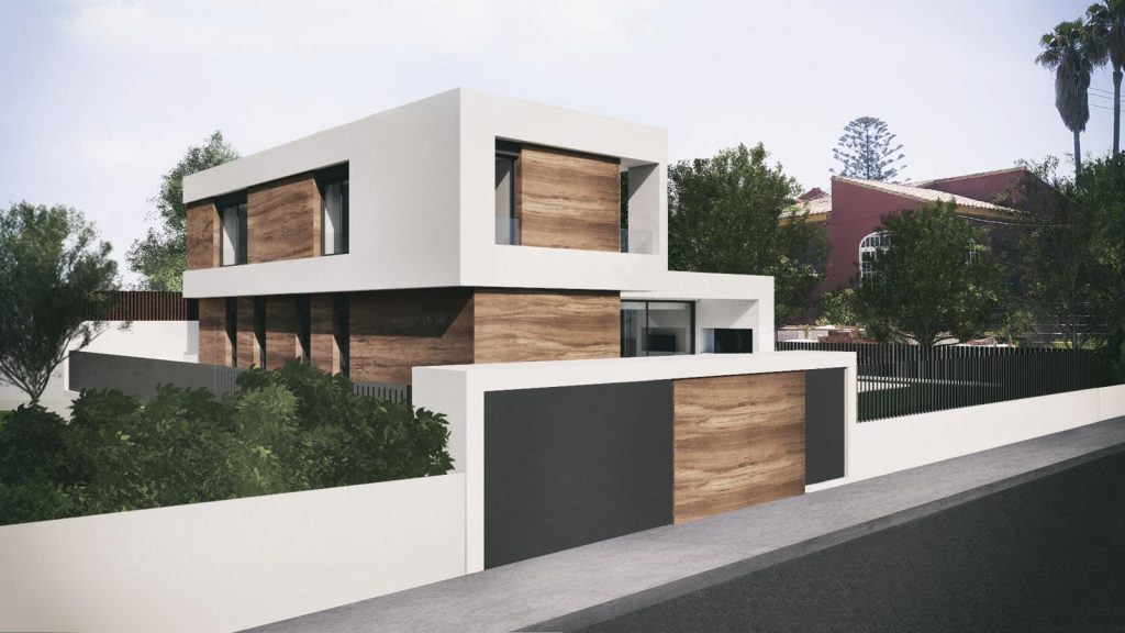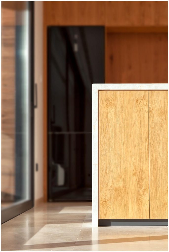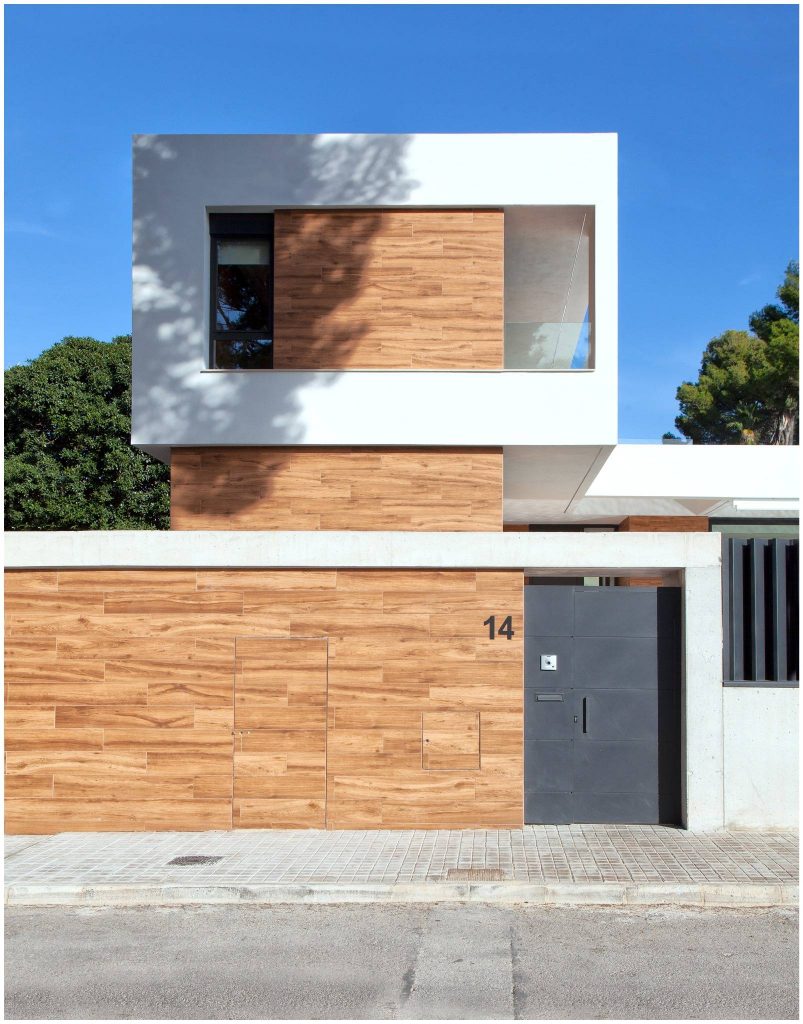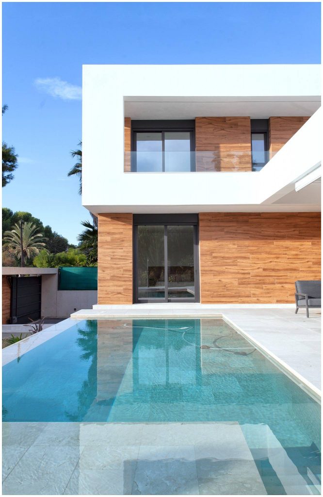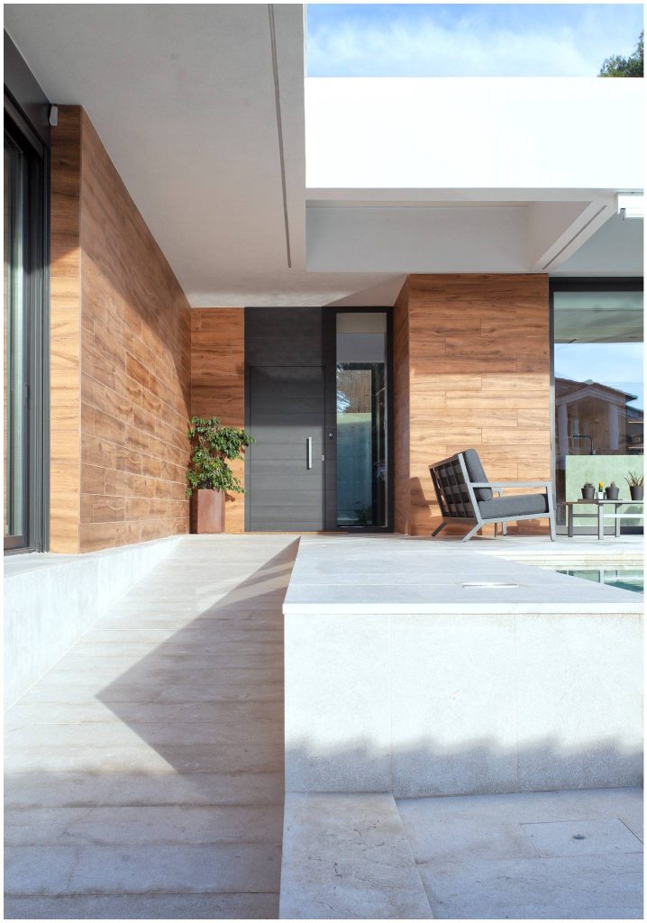 El revoco blanco y el porcelánico imitación madera conforman la materialidad de la fachada de la casa, y el mármol crema marfil abujardado el des pavimento exterior. En el interior nos encontramos con un suelo también de mármol crema marfil, pero en este caso apomazado, y con panelados de madera natural de roble americano. Para el revestimiento de la piscina también se ha utilizado un mármol crema marfil con
