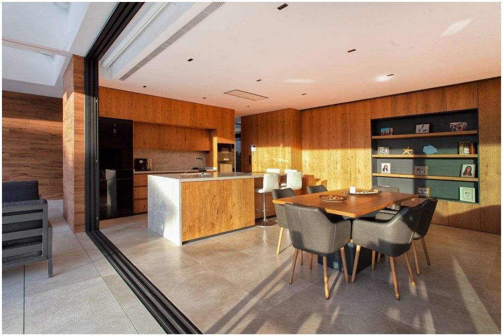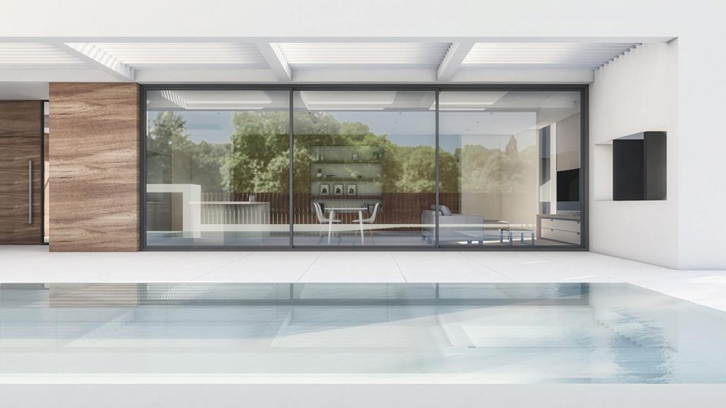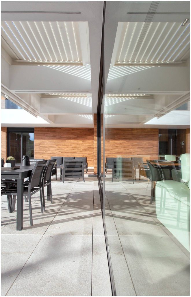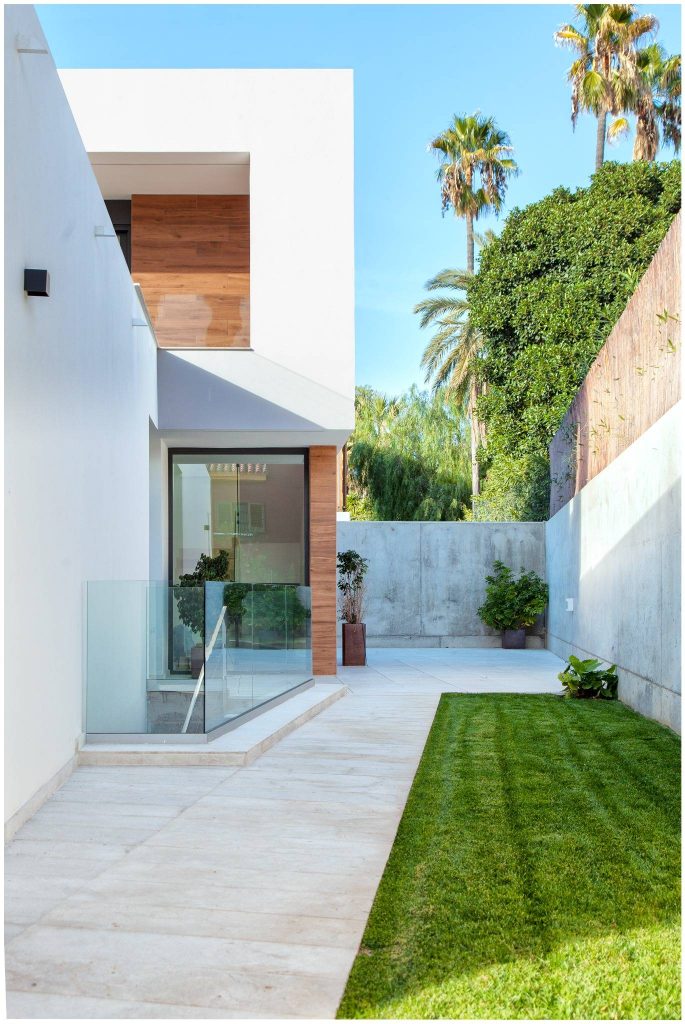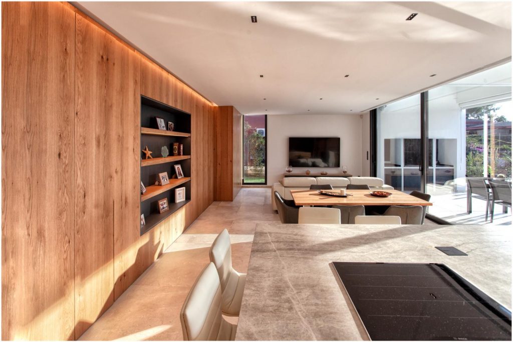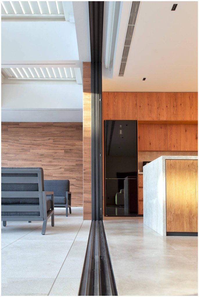El revoco blanco y el porcelánico imitación madera conforman la materialidad de la fachada de la casa, y el mármol crema marfil abujardado el des pavimento exterior. En el interior nos encontramos con un suelo también de mármol crema marfil, pero en este caso apomazado, y con panelados de madera natural de roble americano. Para el revestimiento de la piscina también se ha utilizado un mármol crema marfil con